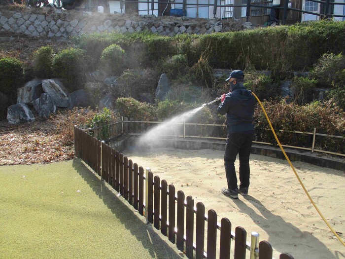 | ▲ 모래놀이터 소독 작업을 하고 있는 모습. (사진=성동구청 제공) |
