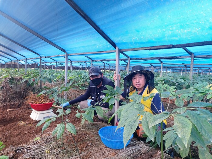 | ▲ 최근 폭우로 피해를 입은 백학지역의 인삼재배농가를 찾아 복구에 구슬땀을 흘리고 있는 최종철 조합장(오른쪽). |