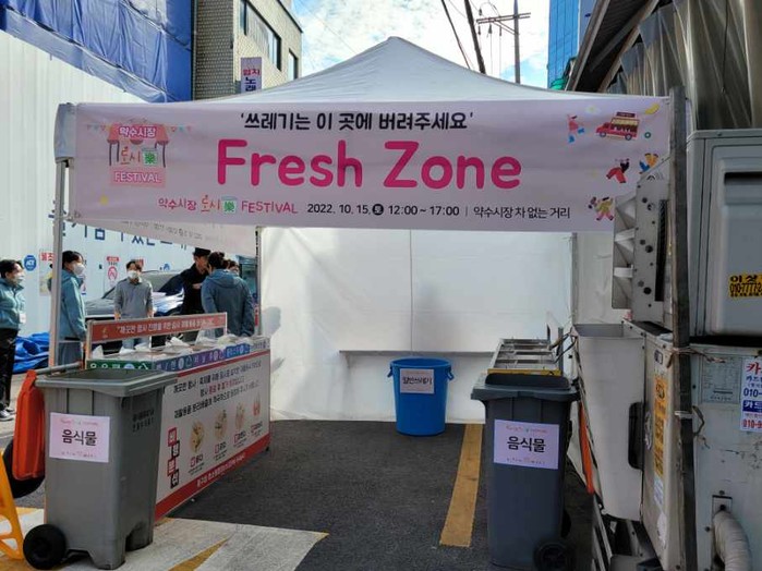 | ▲ '약수시장 도시락 페스티벌' 행사장에 설치된 재활용품 분리수거함.(사진제공=중구청) |