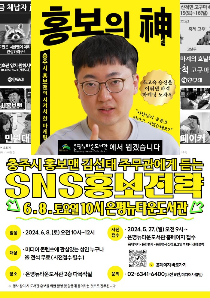 은평뉴타운도서관은 충주시 홍보맨이자 ‘충TV’ 운영자인 김선태 주무관을 초청해 특강을 개최했다. 이번 특강은 오는 27일 오전 9시부터 은평뉴타운도서관 누리집에서 선착순으로 사전 신청 후 참여할 수 있다.