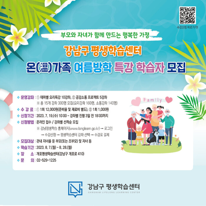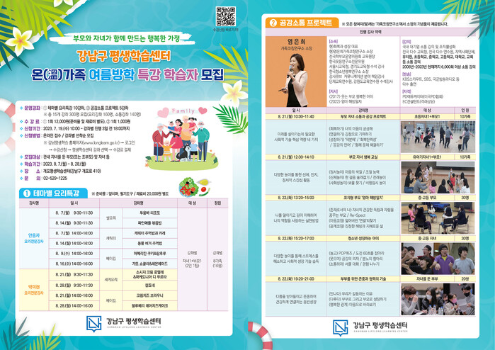 개포평생학습센터에서는 구민 300명을 대상으로 가족이 함께 테마요리를 배우고 전문가에서 소통법을 배울 수 있는 ‘온(溫)가족 여름방학 특강 프로그램’을 운영한다.