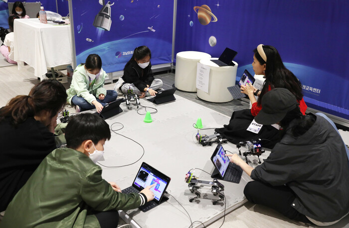 | ▲ 강남미래교육센터에서 열린 과학 페스티벌에서 코딩 미션을 하고 있는 아이들. (사진=강남구청 제공) |
