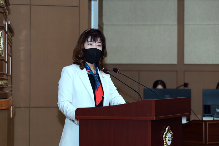 | ▲ 강명숙 의원이 제254회 제2차 본회의에서 구정질문을 하고 있는 모습. (사진제공=마포구의회) |