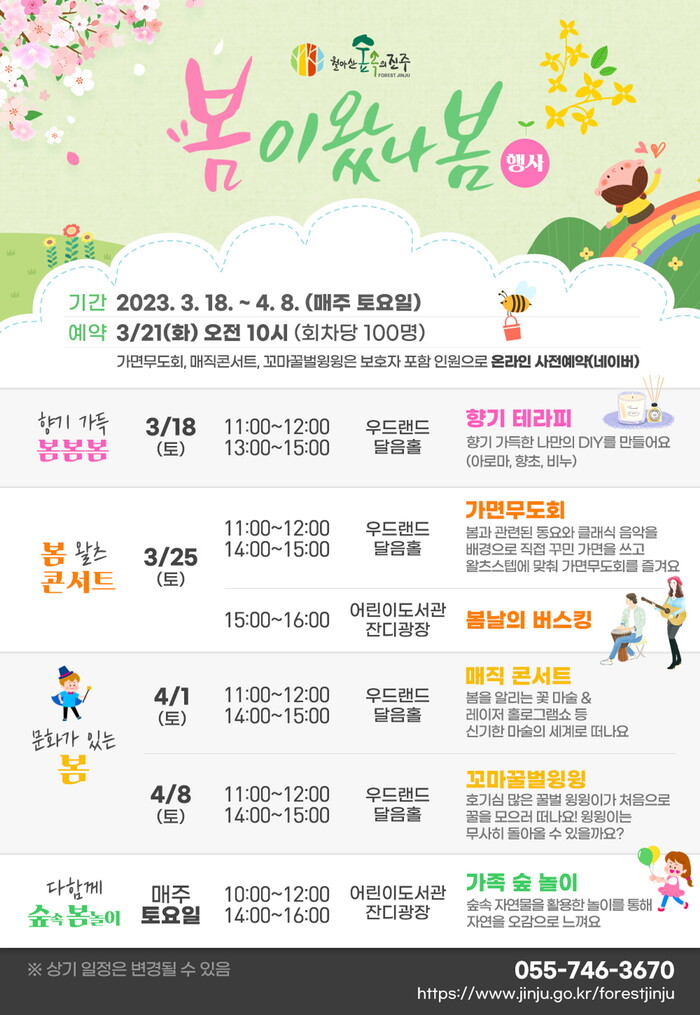 이번 행사는 매주 토요일마다 체험과 공연을 진행해 진주시민이 다채로운 문화행사를 즐길 수 있도록 기획했다. 또한, 숲속 자연물을 이용한 야외놀이와 만들기 체험은 매주 토요일 숲속어린이도서관 잔디광장에서 진행된다.