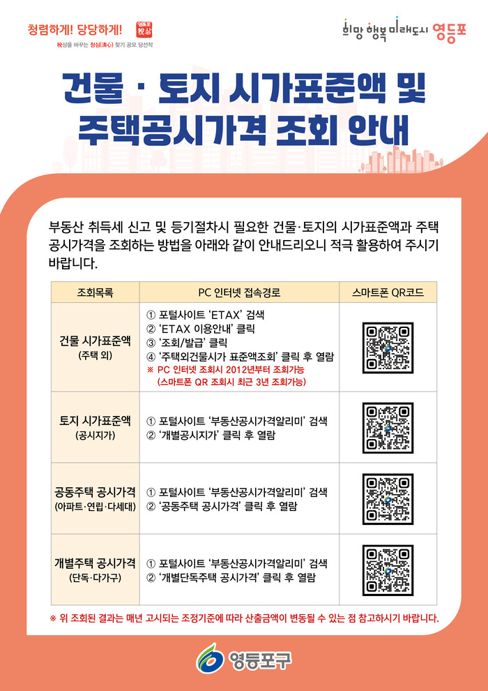 안내문에는 ▲건물 시가표준액 ▲토지 시가표준액 ▲공동주택(아파트·연립·다세대) 공시가격 ▲개별주택(단독·다가구) 공시가격을 즉시 열람할 수 있는 정보무늬(QR코드)가 포함돼 있다. 스캔만하면 필요한 정보를 한 번에 조회할 수 있어, 대리인을 선임하지 않고 구민 스스로 부동산 행정 업무를 쉽고 편리하게 처리할 수 있다.