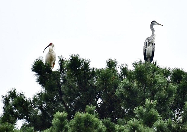 | ▲ 먹이터 근처 인근 산림에서 왜가리와 함께 휴식 중인 우포따오기 모습 (사진제공: 전규동, 최정번 제보자) |