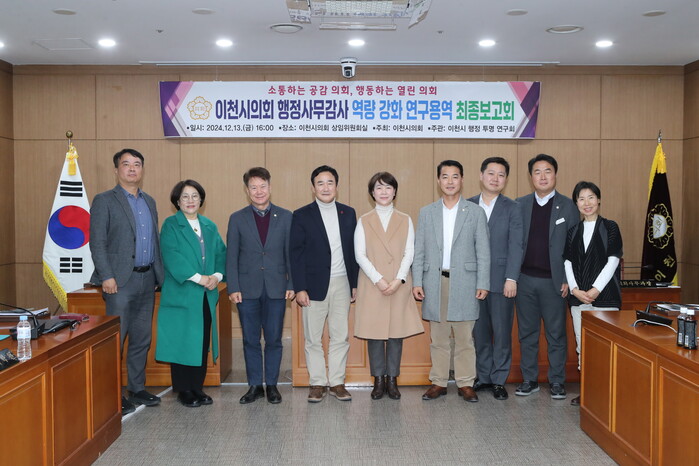 [시민일보 = 민장홍 기자] 경기 이천시의회 의원연구단체 ‘이천시 행정 투명 연구회’가 최근 상임위원회실에서 행정사무감사 역량 강화 연구용역 최종보고회를 개최했다.