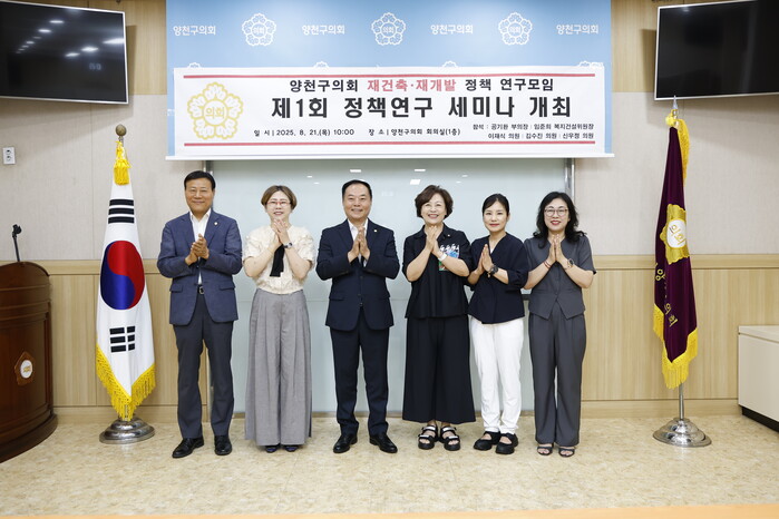 [시민일보 = 박소진 기자] 서울 양천구의회(의장 윤인숙) 의원연구단체인 ‘양천구 재개발·재건축 정책 연구모임’이 최근 구의회 1층 회의실에서 제1차 정책연구 세미나를 개최했다.