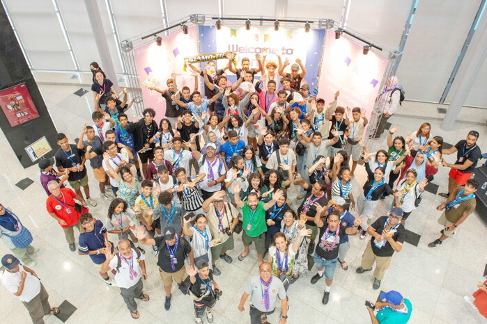 | ▲ 새만금 세계스카우트잼버리 대원들이 용인포은아트홀에 마련된 포토존에서 사진 촬영을 하고 있다. |