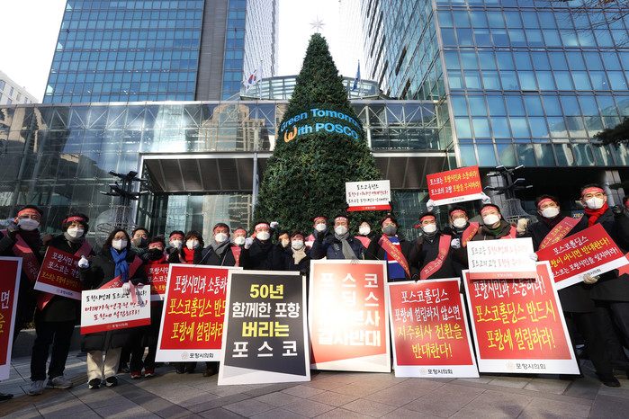 포스코 2022년 임시주주총회가 열린 지난 28일 오전 서울 강남구 포스코센터 앞에서 포항 시민단체, 포항시의회, 경북도의회 등이 지주사 전환 반대 기자회견을 하고 있다.