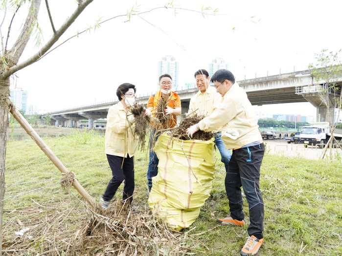 | ▲ 구의회 의원들이 안양천 일대에서 쓰레기 및 부유물 잔재 등을 치우고 있는 모습. (사진제공=양천구의회) |