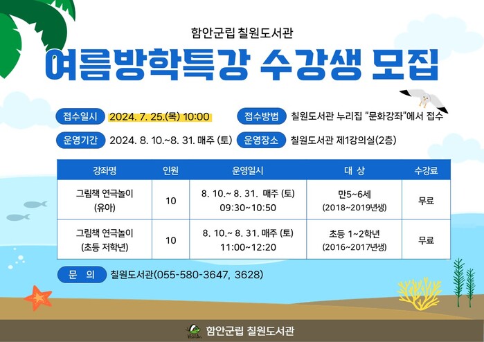 [함안=최성일 기자] ‘함안군립 칠원도서관은 오는 25일부터 관내 유아 및 초등 저학년을 대상으로 2024년 여름특강 수강생을 모집한다.