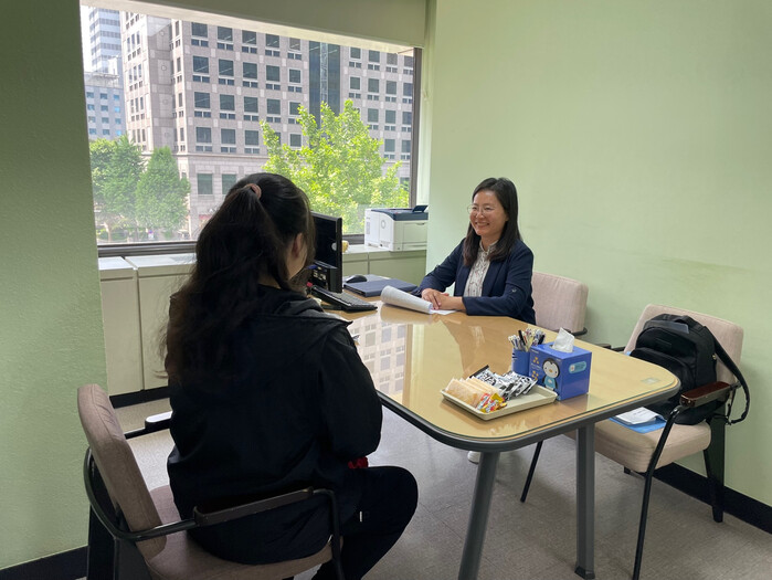 | ▲ 청년재단과 한국고용정보원의 ‘찾아가는 상담’이 진행되는 청년다다름사업 서울제작소 현장. 한국고용정보원의 전문상담사가 청년과 1:1 상담을 진행하고 있다. (사진=청년재단 제공) |