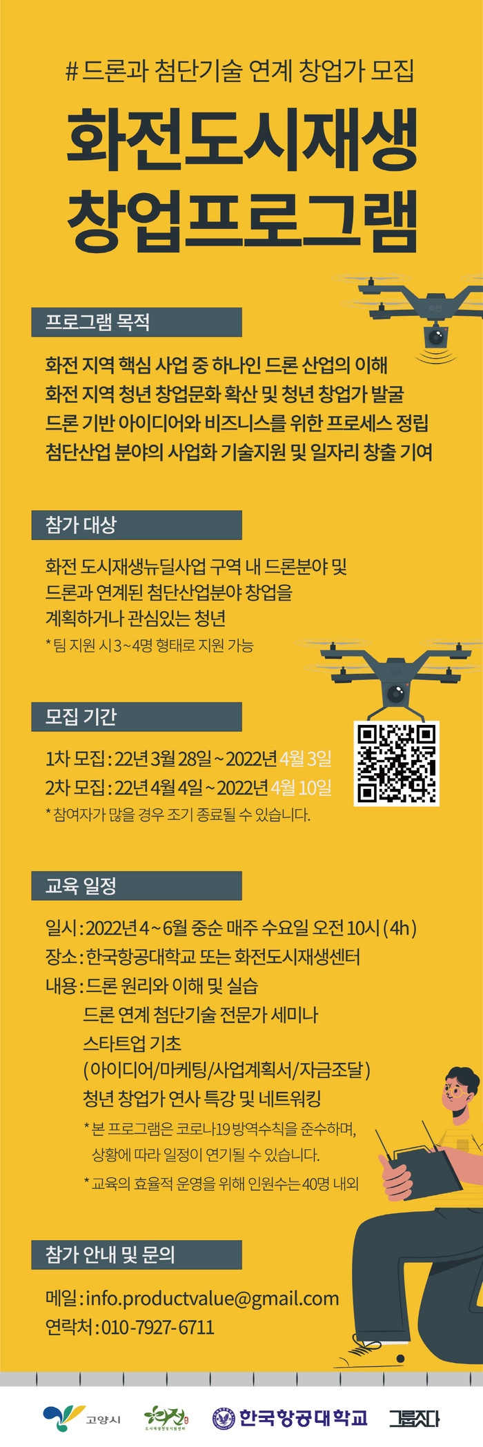 창업프로그램은 화전 도시재생 뉴딜사업 구역 내에서 드론 및 드론연계 첨단기술 창업에 관심 있는 청년이라면 누구나 신청할 수 있으며, 오는 4월 10일까지 온라인 신청서를 제출하면 된다.