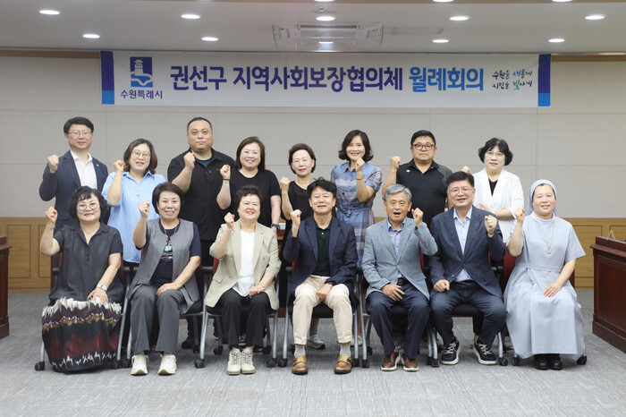 경기 수원시 권선구가 27일 권선구 지역사회보장협의체 2025년 6월 정례회의를 진행했다. 이번 정례회의에서는 ▲구 지역사회보장협의체 위원 성인지 교육 실시 ▲평동, 서둔동 지역사회보장협의체와 우만지역자활센터 특화사업 우수사례를 공유하는 시간을 보냈다. 사진은 정례회에 참석한 김종석 구청장(앞줄 가운데)이 참석자들과 기념촬영을 하고 있는 모습. (사진=권선구청 제공)