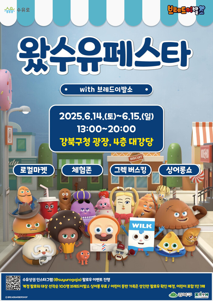 특히, 이번 ‘왔수유페스타’는 인기 애니메이션 ‘브레드이발소’의 친구들이 수유상권을 함께 탐험하는 콘셉트로 꾸며져, 방문객들이 수유의 다양한 매력과 발전 가능성을 보다 친근하게 느낄 수 있도록 ▲팝업스토어 ▲체험존 ▲싱어롱쇼 등 풍성한 콘텐츠로 구성된다.