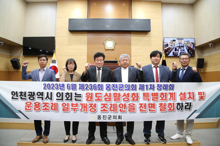 | ▲ 원도심활성화특별회계 설치 및 운용조례 개정안의 전면 철회를 촉구하는 옹진군의원들. (사진=옹진군의회 제공) |