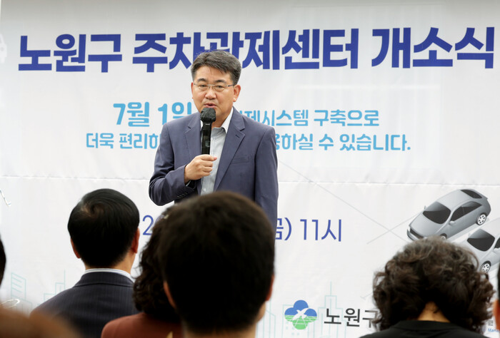 | ▲ 오승록 노원구청장은 27일 오전 서울 노원구 마들근린공원에서 열린 ‘공영주차장 통합관제시스템 개소식’에 참석해 인사말을 하고 있다. (사진=노원구청 제공) |