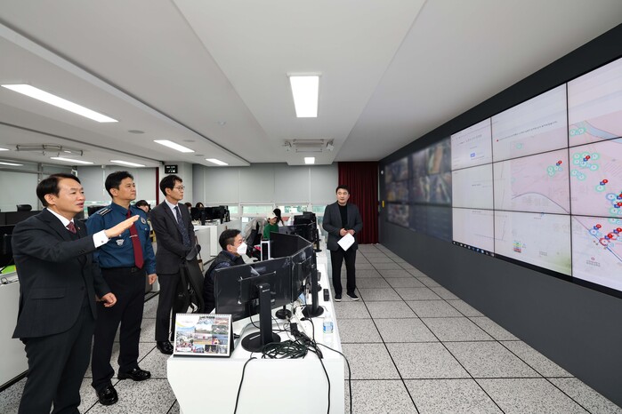 | ▲ 김찬진 구청장이 지능형 영상분석 기반 서비스 시연회에서 현장을 점검하고 있다. (사진=인천 동구청 제공) |