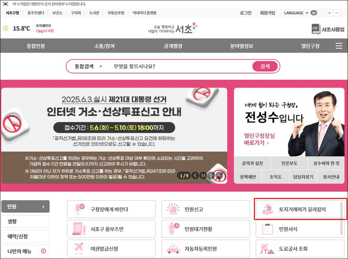 [시민일보 = 박소진 기자] 서초구(구청장 전성수)는 토지거래허가제 확대 시행에 따른 구민 불편 해소를 위해 구청 홈페이지에 ‘토지거래허가 길라잡이’ 시스템을 구축해 운영에 나선다고 밝혔다.