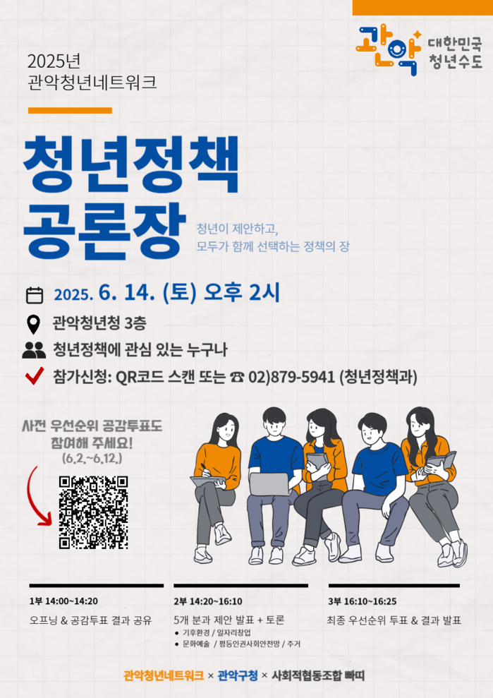 정책에 대한 온라인 사전투표 등 청년정책 공론장에 참여를 희망하는 주민은 포스터 내 QR코드를 통해 확인하거나, 관악구청 청년정책과로 문의하면 된다. 사전투표는 6월 2일부터 12일까지 10일간 진행된다.