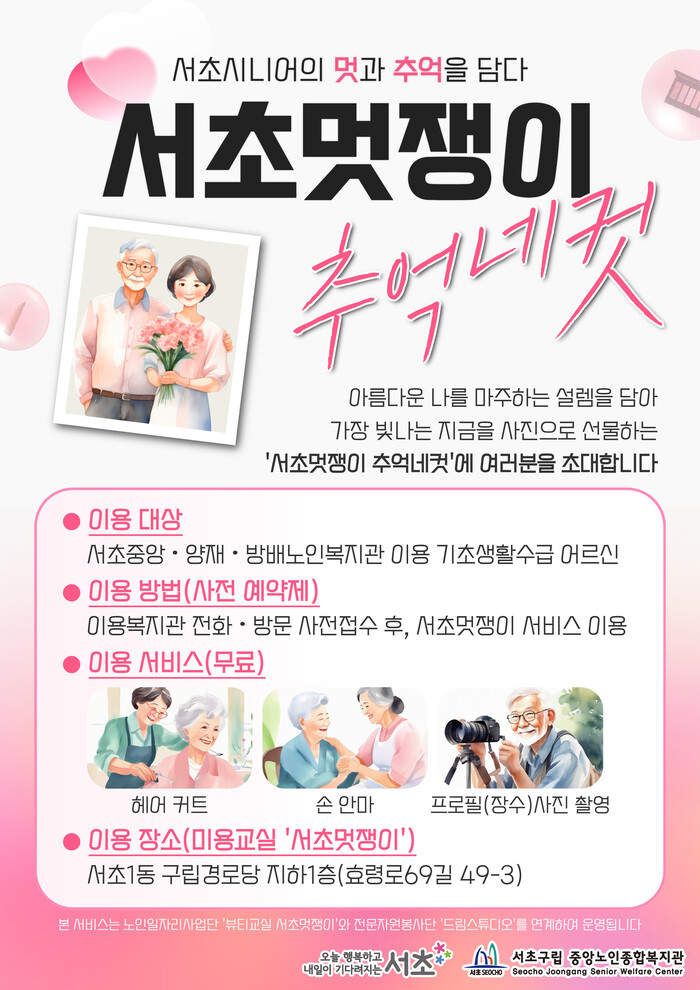 ‘서초멋쟁이 추억네컷’ 사업은 올해 서초구에서 운영 중인 2228개 노인일자리 사업 중 하나로, 노인의 자존감과 삶의 활력을 회복하고, 일상의 자신감을 높이기 위한 서초 맞춤형 복지 프로그램이다.