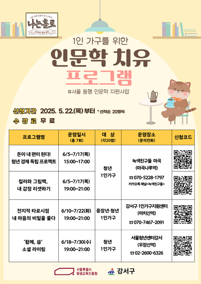이번 강좌는 1인 가구의 정서적 안정과 자존감 회복을 돕고, 개인 성장을 지원하기 위해 마련됐다. ‘나는 홀로, 강서에서 함께 동행’이라는 슬로건 아래, 자존감을 높이는 다채로운 프로그램이 준비됐다.