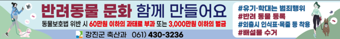 강진군 관계자는 “모든 주민이 함께 안전하고 행복한 생활을 영위할 수 있도록, 성숙한 반려동물 문화조성에 적극 동참하여 주길 바란다”고 당부했다.