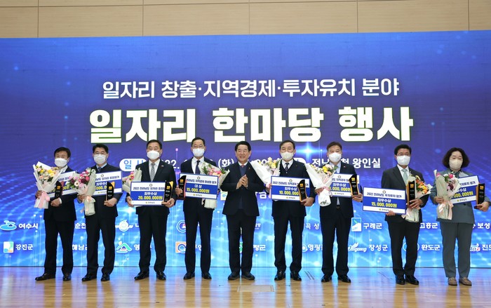 | ▲ 명현관 군수(왼쪽 네 번째)가 지난 13일 전라남도 일자리한마당 행사 시상식에서 지역경제활성화 평가 대상을 수상하고 기념촬영을 하고 있다. (사진제공=해남군청) |