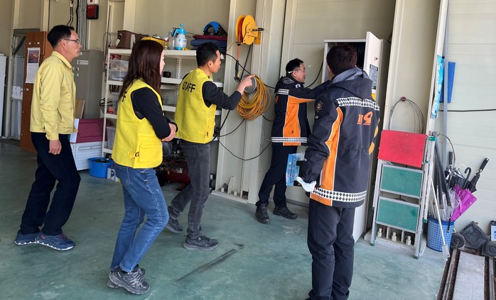이날 현장점검은 소방서, 군, 에어랜드항공 관계자가 함께 참여해 △소화기 및 AED 비치.작동 여부 △소화전 작동상태 △위험물 취급 여부 △안전사고 발생 시 비상체계 연락망 등을 꼼꼼히 점검했다.