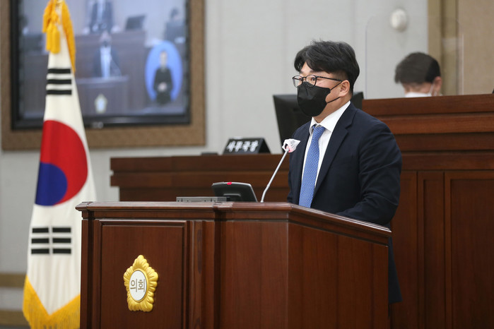 | ▲ 이희승 의원이 ‘민간·가정 어린이집 보육교직원 처우 개선 촉구 건의안’을 설명하고 있다. (사진제공=수원시의회) |
