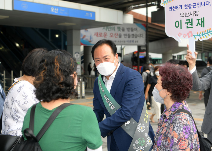 | ▲ 민선8기 첫 출근을 한 이권재 오산시장이 주민들과 악수를 하고 있다. (사진제공=오산시청) |