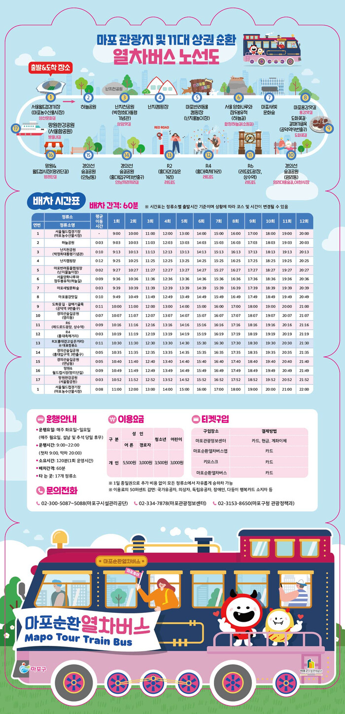 아울러 티켓은 ‘레드로드 R2’에 있는 ‘마포관광정보센터 매표안내소’와 ‘마포순환열차버스’에서 구입할 수 있다.