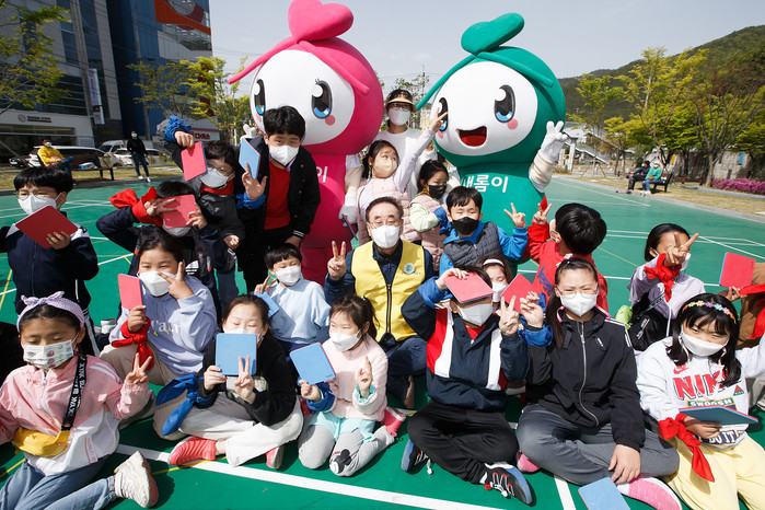 | ▲ 장세용 시장(가운데)이 꾸러기 놀자학교에 참석한 아이들과 기념촬영을 하고 있다. (사진제공=구미시청) |