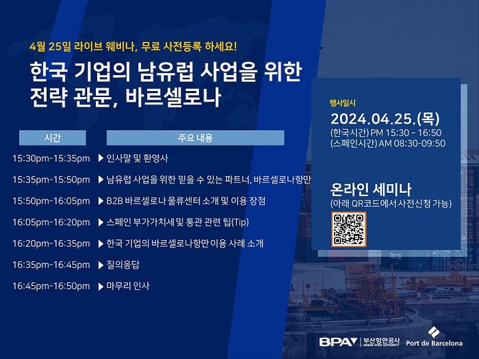 BPA는 2021년 바르셀로나항만공사와 현지 합작법인 ‘B2B 로지스틱스 부산 바르셀로나 허브(B2B Logistics Busan Barcelona Hub)을 설립하여 바르셀로나항 배후에서 물류센터를 운영 중이다. BPA는 이번 온라인 세미나를 통해 우리 기업들에게 바르셀로나항을 통한 남유럽 시장 진출 정보를 제공할 예정이다.