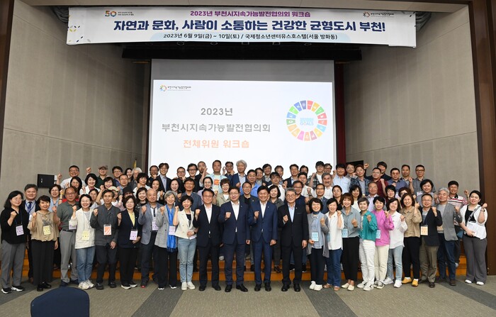 | ▲ 조용익 시장이 지난해 6월 민관 협의체인 ‘부천시 지속가능발전협의회’ 전체 위원 워크숍에 참여해 단체 사진을 촬영하고 있다. (사진=부천시청 제공) |