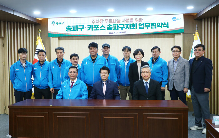 [시민일보 = 이대우 기자] 서울 송파구의회가 최근 구청 기획상황실에서 주차장 무료나눔 사업을 위한 송파구·카포스 송파구지회 업무 협약식을 개최했다.