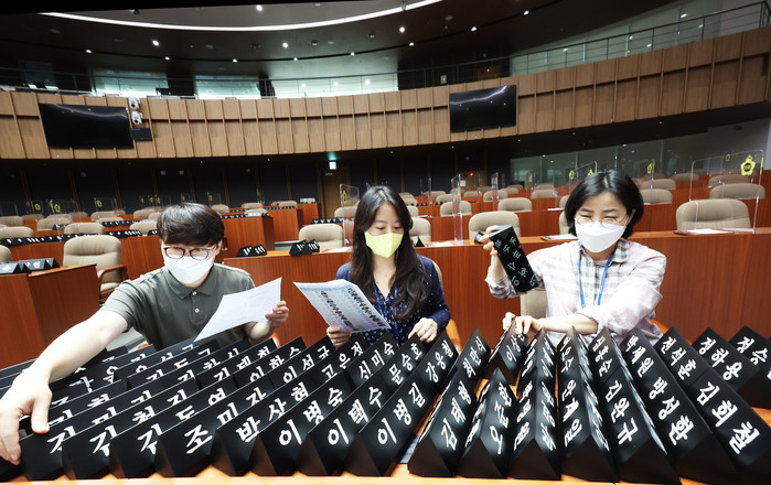 | ▲ 지난 4일 오후 경기도 수원시 경기도의회에서 관계자들이 개원을 앞두고 의원 명패를 정리하고 있다. (사진제공=연합뉴스) |