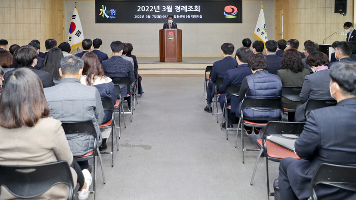 합천군(군수 문준희)은 7일 군청 대회의실에서 3월 정례조회를 개최했다. 이번 정례조회는 코로나 백신접종 완료자인 공직자 및 일반인 100여 명이 참석한 가운데 진행됐다. 정부의 사회적 거리두기 조정안에 따라 접종여부와 관계 없이 최대 299명까지 행사가 가능하나, 코로나19 확산세 속에 군민 안전을 위해 접종완료자로 입장을 제한했다.