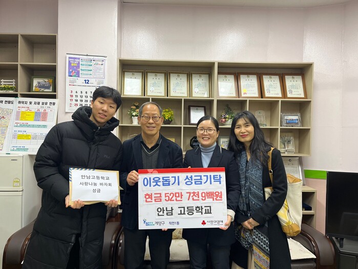 [인천=문찬식 기자] 인천 계양구 작전1동(동장 이경숙)은 지난 12월29일 안남고등학교 학생들이 지역사회 소외계층을 돕는 데 사용해 달라며 ‘사랑 나눔 바자회’ 행사를 통해 마련된 수익금 52만 7천9백원 전액을 기부했다고 밝혔다.