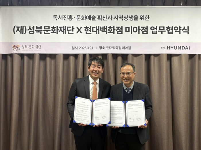 이날 협약식에는 서노원 성북문화재단 대표이사, 오형만 현대백화점 미아점 지점장을 비롯해 관계자들이 참석했다. 이번 협약을 통해 양 기관은 ▲성북구립도서관과 연계한 독서문화 확산 사업 ▲지역 기반의 전시 및 공연 콘텐츠 공동 기획 ▲기타 협약 목적 달성을 위한 상호 협의 사업 등 다양한 분야에서 협력해 나가기로 했다.