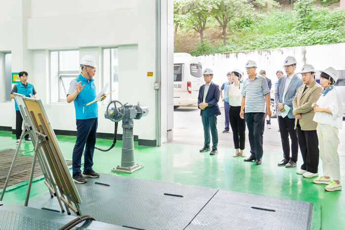 | ▲ 대치유수지 빗물펌프장에서 시설물 관리현황을 청취하고 있는 강남구의회 생활안전 및 환경점검 특별위원회 위원들. (사진= 강남구의회 제공) |