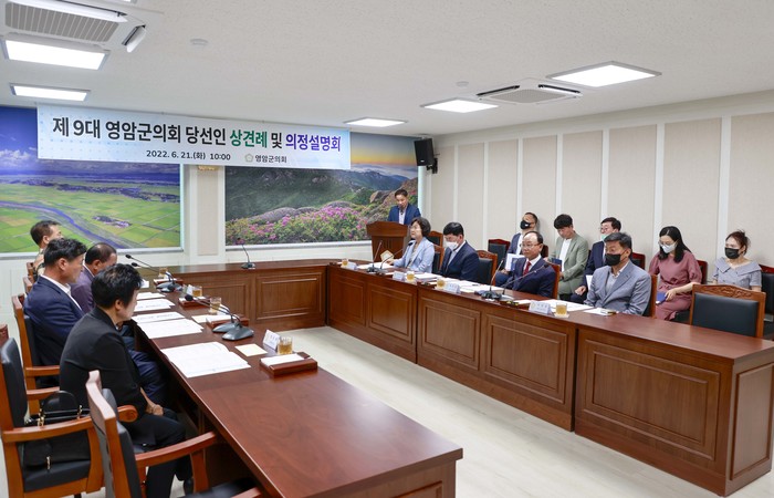 | ▲ ‘제9대 영암군의회 당선인 상견례 및 의정설명회’에 참석한 당선의원들이 의정활동 전반에 대한 설명을 듣고 있다. (사진제공=영암군의회) |