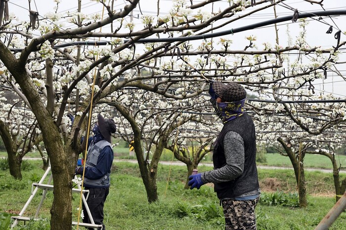 [영암=정찬남 기자] 지난 8일 영암군 덕진면 운암리 들녘의 한 과수농장에서 활짝 만개한 배꽃에 꿀벌을 대신한 수정 작업이 한창이다. ‘위로·위안’의 꽃말을 지닌 배꽃이 봄을 만끽하는 상춘객에게는 위로를, 풍년을 기원하는 농민에게는 위안을 되길…