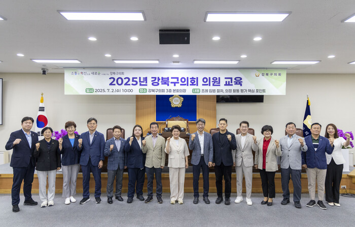 서울 강북구의회는 최근 의원들의 입법 역량 강화와 의정활동 전문성 향상을 위해 ‘조례 입법 절차’와 ‘의정활동 평가 핵심 포인트’를 주제로 2025년 의원 교육을 실시했다. 사진은 김명희 의장(가운데)과 강북구의회 의원들이 기념촬영을 하고 있는 모습. (사진=강북구의회 제공)