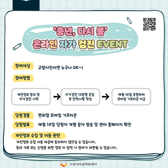 [고양=이기홍 기자] 고양시 자살예방센터가 40대~50대 중장년층의 자살률을 낮추고 자살고위험군을 조기 발굴하기 위해 챗봇을 활용한 온라인 우울 자가검진‘중년, 다시 봄’ 이벤트를 진행한다.
