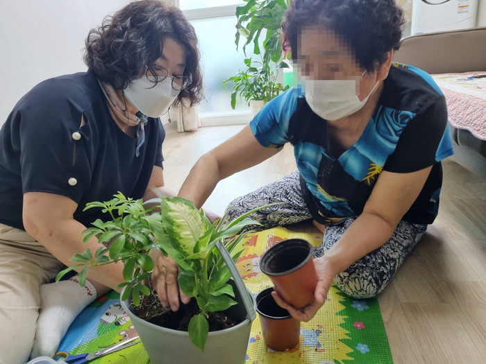 사업 기간 동안 원예치유사가 생활지원사와 함께 독거노인의 가정에 방문해 반려식물을 활용한 원예치유 활동을 진행했다.