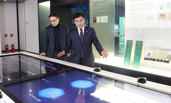 | ▲ 염종현 경기도의회 의장(오른쪽)이 경기마루 내부를 살펴보고 있다. (사진=경기도의회 제공) |