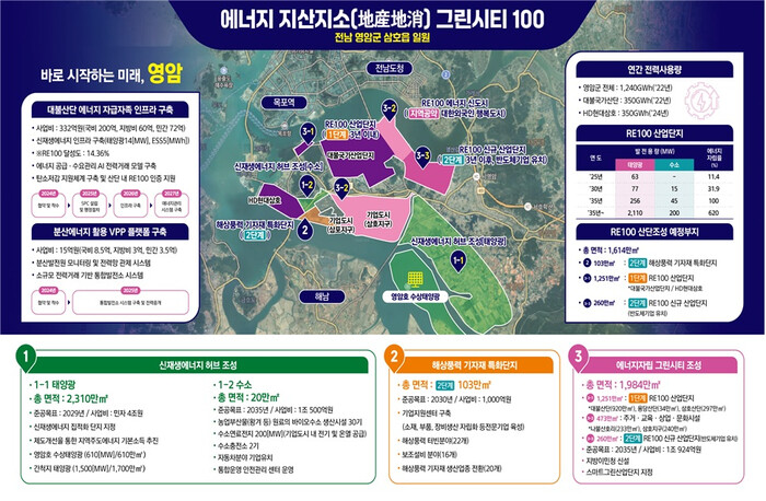 군은 지난 7월 ‘에너지 지산지소 그린시티 100’ 정책을 발표하고, ▲신재생에너지 허브-재생에너지 집적화단지 ▲해상풍력 기자재 특화단지 ▲에너지자립 그린시티를 조성하는 에너지 대전환 청사진을 밝혔다.