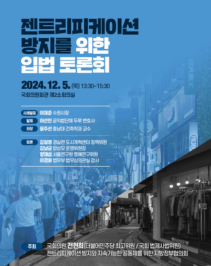 이번 입법토론회는 임차인의 권리보장과 지속가능한 상권을 위한 젠트리피케이션 방지 관련 3법인 「상가건물 임대차보호법(이하 '상가임대차법')」, 「지역상권 상생 및 활성화에 관한 법률(이하 '지역상권법')」, 「부동산 거래신고 등에 관한 법률(이하 '부동산거래신고법')」을 논의하기 위한 것으로, 정원오 성동구청장이 회장을 맡고 있는 ‘젠트리피케이션 방지와 지속가능한 공동체를 위한 지방정부협의회’(이하 ‘지방정부협의회’)와 더불어민주당 전현희 최고위원(서울 중구‧성동구갑 국회의원)이 공동 주최한다.